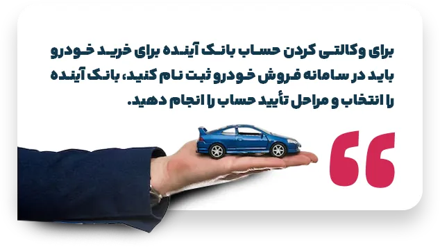 - به یکی از روشهای آنلاین یا حضوری، حساب خود در بانک آینده را به نفع شرکت خودروساز وکالتی میکند (مبلغ مورد نیاز معمولاً معادل بخشی یا کل وجه خودرو است).