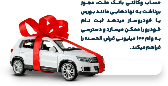 وام حساب وکالتی بانک ملت، تسهیلاتی قرضالحسنه است که بهمنظور تأمین وجه موردنیاز برای ثبتنام در طرحهای فروش خودرو یا معاملات بورس کالا طراحی شده است. این وام با سقف ۱۰۰ میلیون تومان، بدون نیاز به ضامن و با کارمزد ناچیز (۱۵۰ هزار تومان) ارائه میشود. مدت بازپرداخت آن معمولاً کوتاهمدت (تا ۱۲ ماه) است، که باعث میشود فشار مالی کمتری به شما وارد شود.
