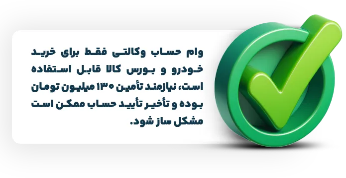 هرچند این وام مزایای زیادی دارد، اما محدودیتهایی هم وجود دارد. اولاً، این تسهیلات فقط برای خرید خودرو یا معاملات بورس کالا قابل استفاده است و نمیتوانید از آن برای اهداف دیگر (مثل خرید مسکن) استفاده کنید. ثانیاً، مبلغ ۱۳۰ میلیون تومان که باید تأمین کنید، که ممکن است برای برخی افراد چالشبرانگیز باشد. همچنین، فرآیند تأیید حساب وکالتی گاهی تا ۳ روز طول میکشد، که اگر در روزهای پایانی مهلت ثبتنام اقدام کنید، ممکن است به مشکل بربخورید.