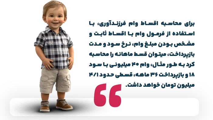 برای محاسبه اقساط وام فرزندآوری، ابتدا باید مبلغ وام، نرخ سود و مدت زمان بازپرداخت را مشخص کنید. سپس، با استفاده از فرمول زیر، مبلغ قسط ماهانه را محاسبه نمایید: