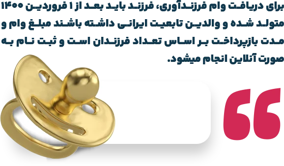- کارمزد: وام فرزندآوری معمولاً دارای کارمزد ۴ درصد است که به اصل وام اضافه میشود.